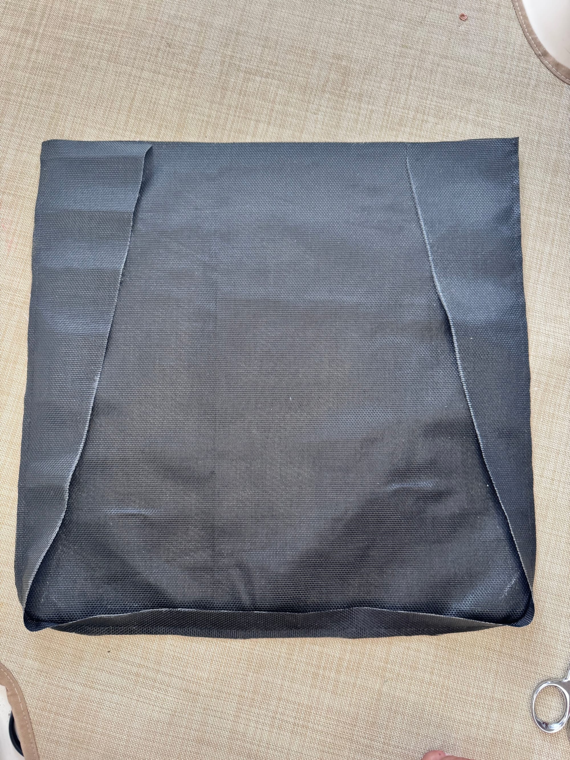 Phifertex can be cut with regular scissors and it won’t unravel. Over time you may notice small white fibers along the cut edge, so I placed my seams on the inside of the pockets and folded the top edge to keep everything looking clean.