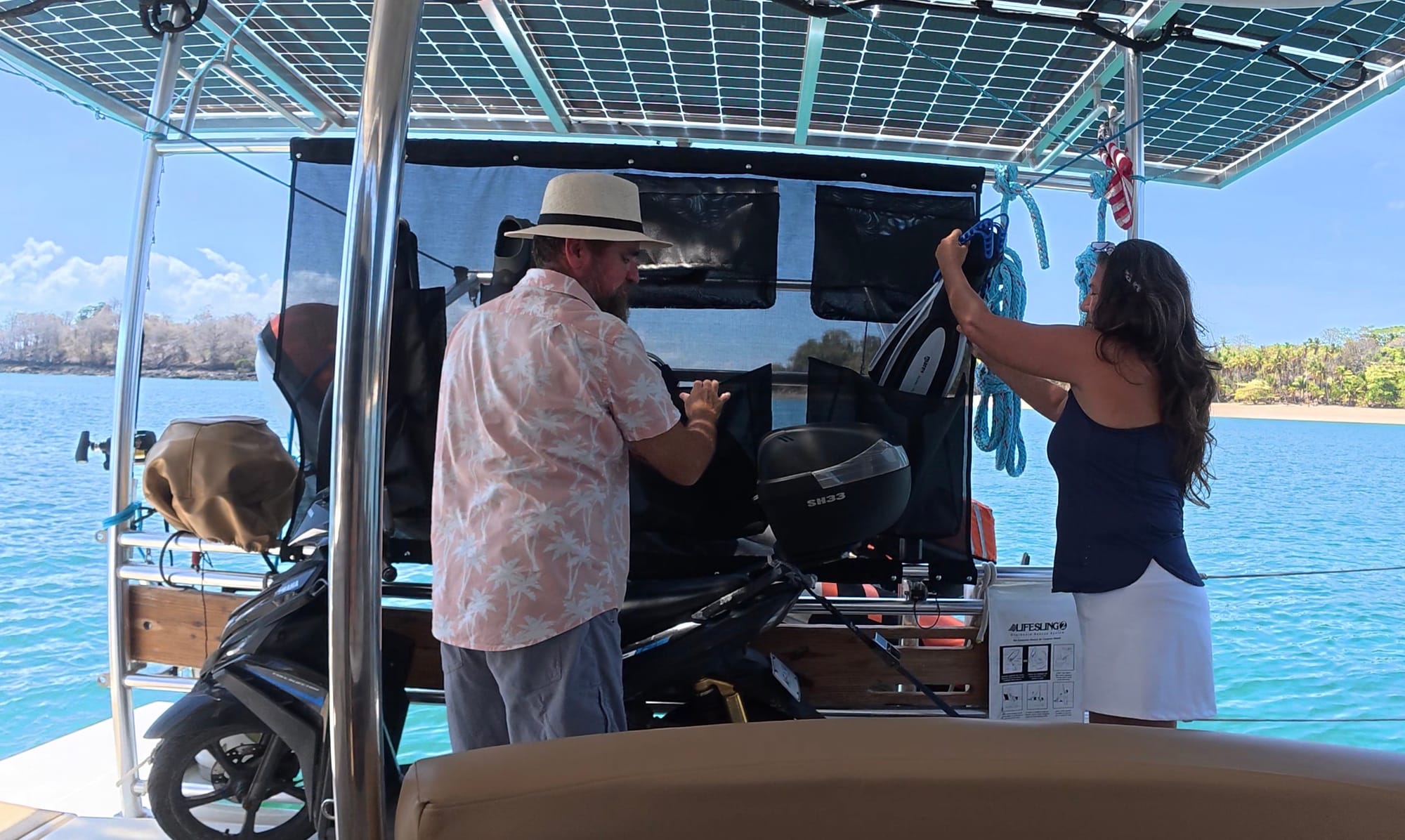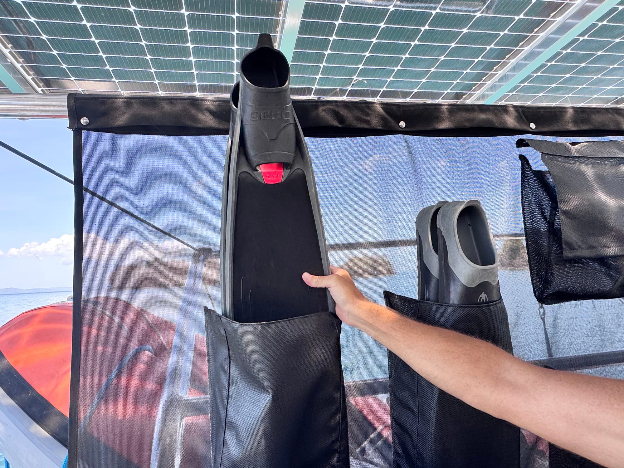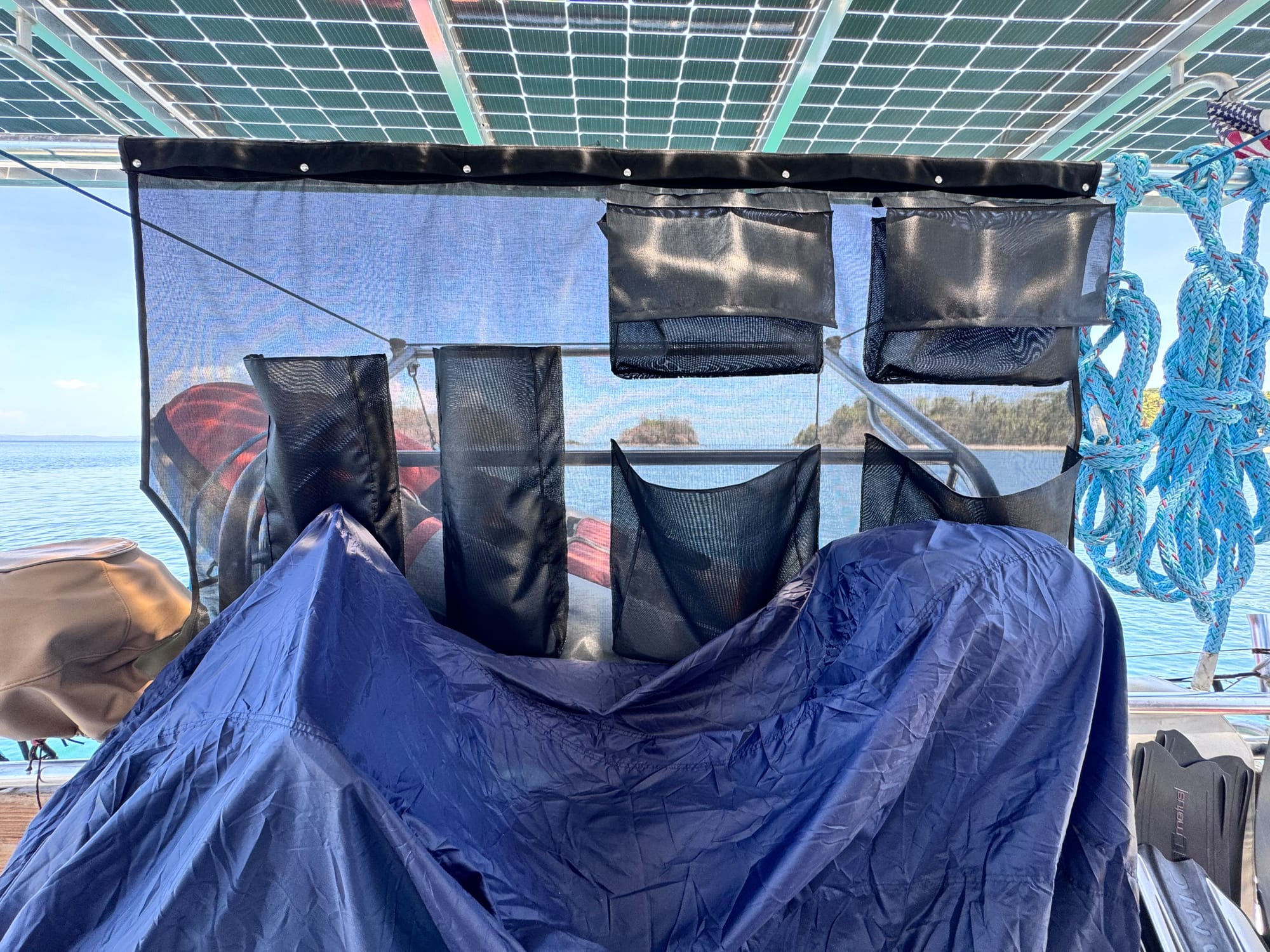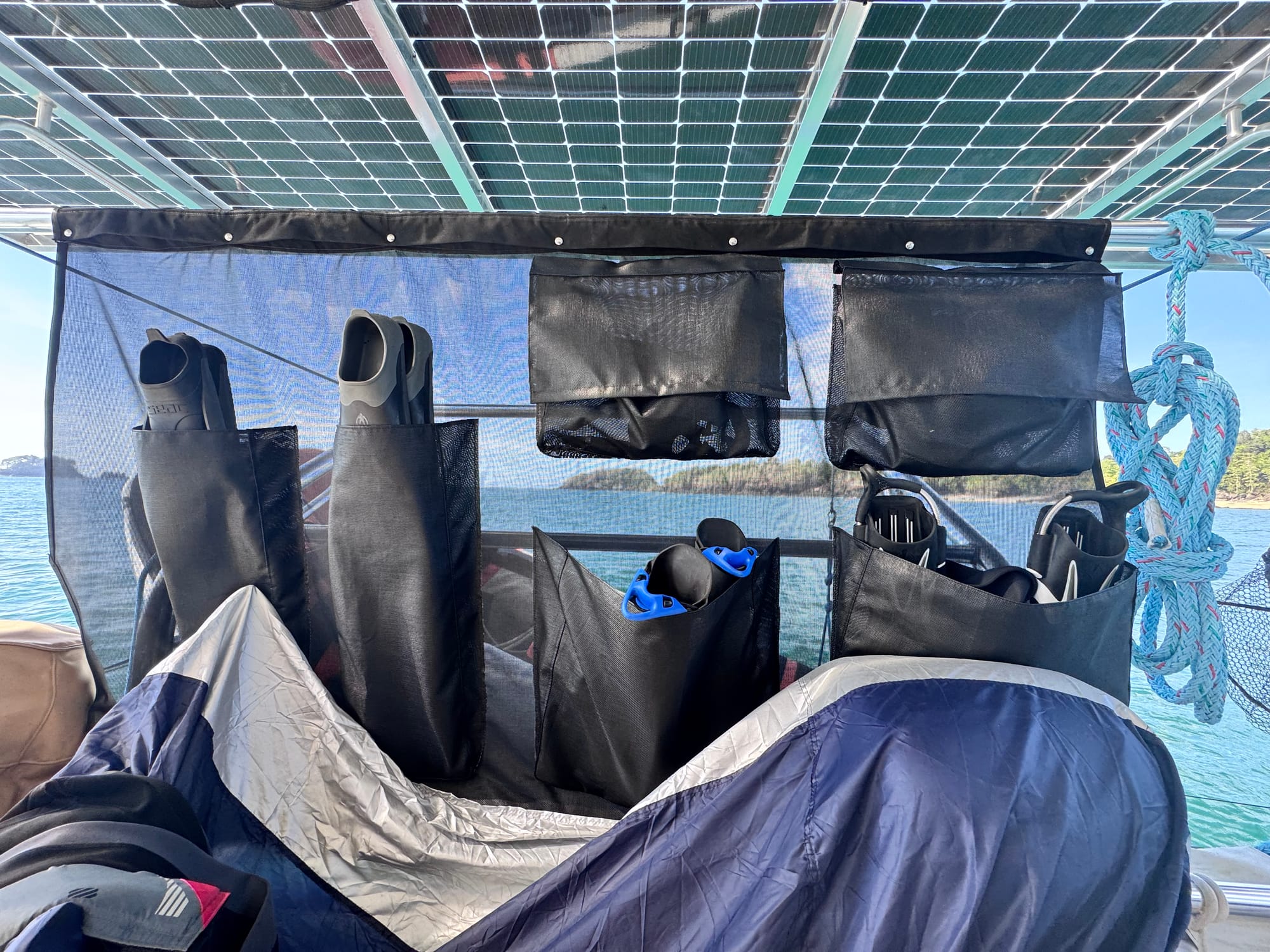 DIY sailboat upgrade on our Leopard 40 catamaran. We added Phifertex Plus mesh storage pockets to our cockpit sunshade, creating a simple way to store, drain, and dry snorkel and freediving gear.